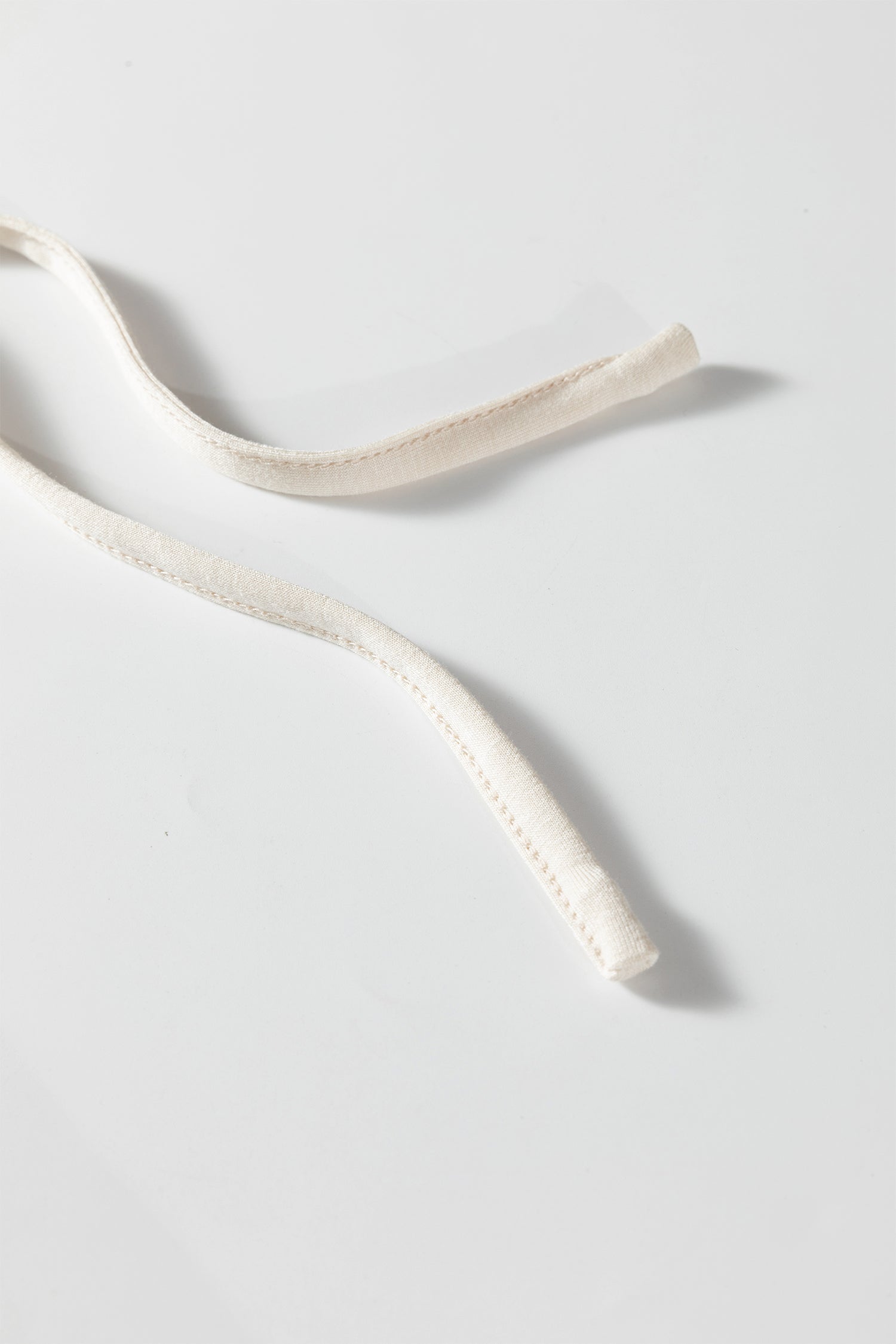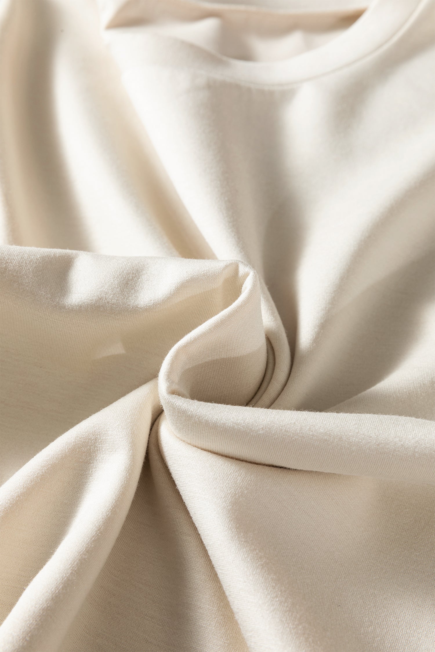 - Clean crewneck tee with contrast striped trim for a sporty-chic touch.