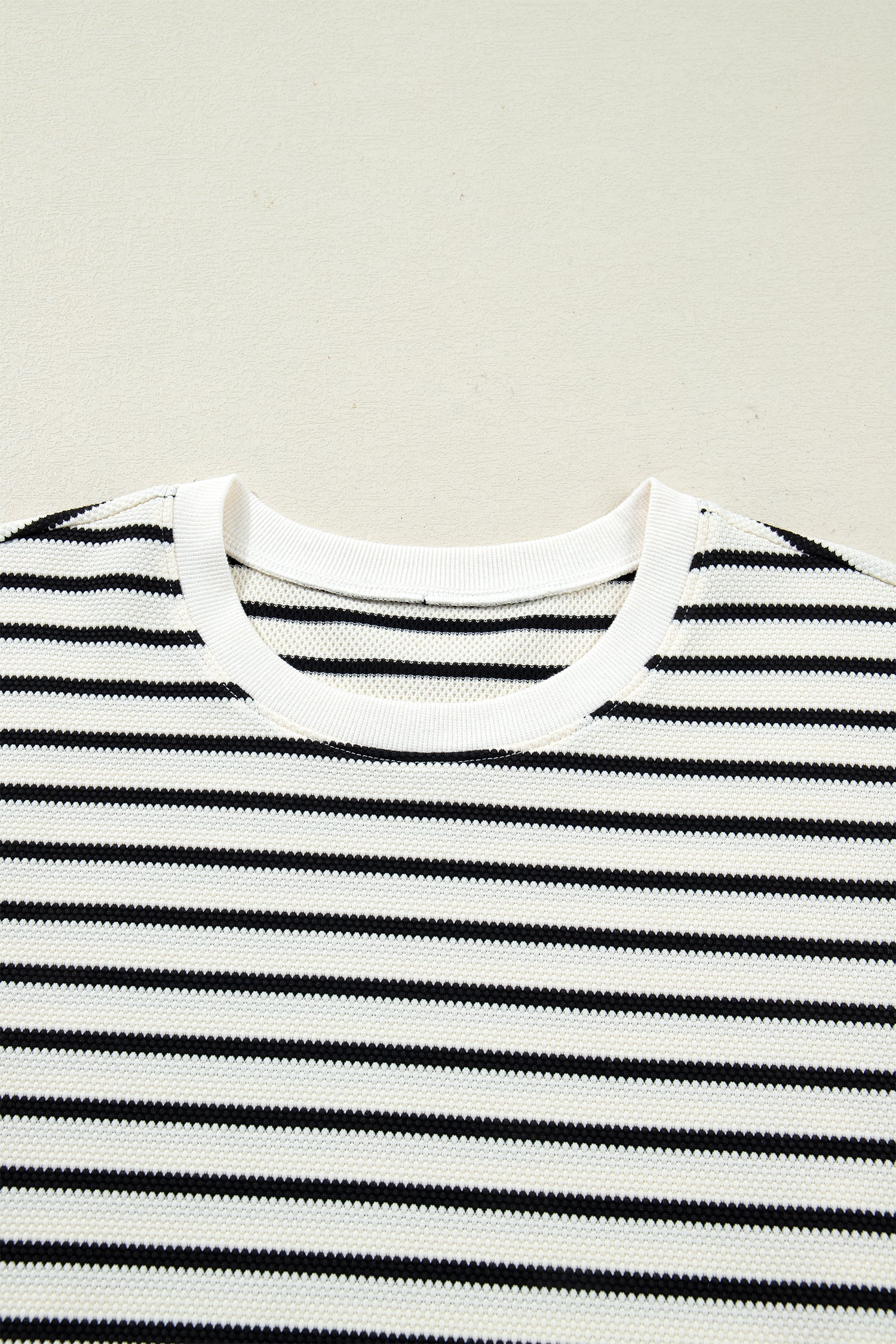 Stacey B's White Stripe Ruffle Trim Drop Shoulder Top Drawstring Loose Pant Set